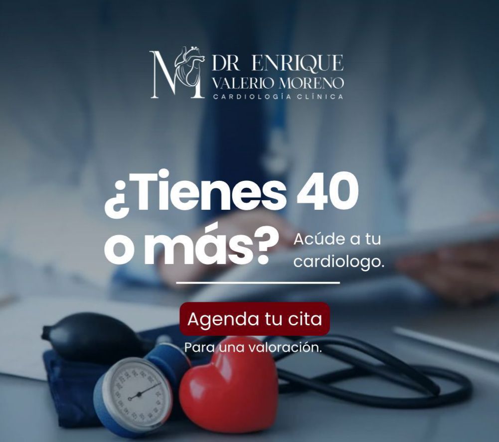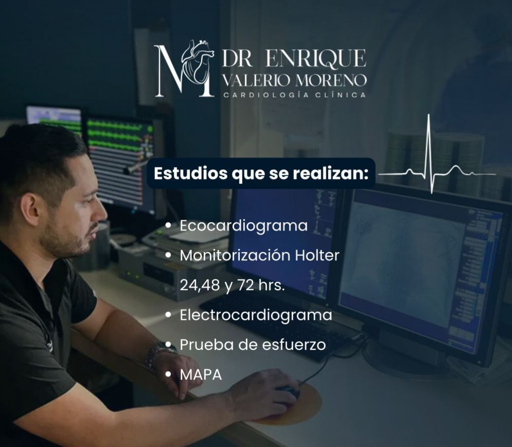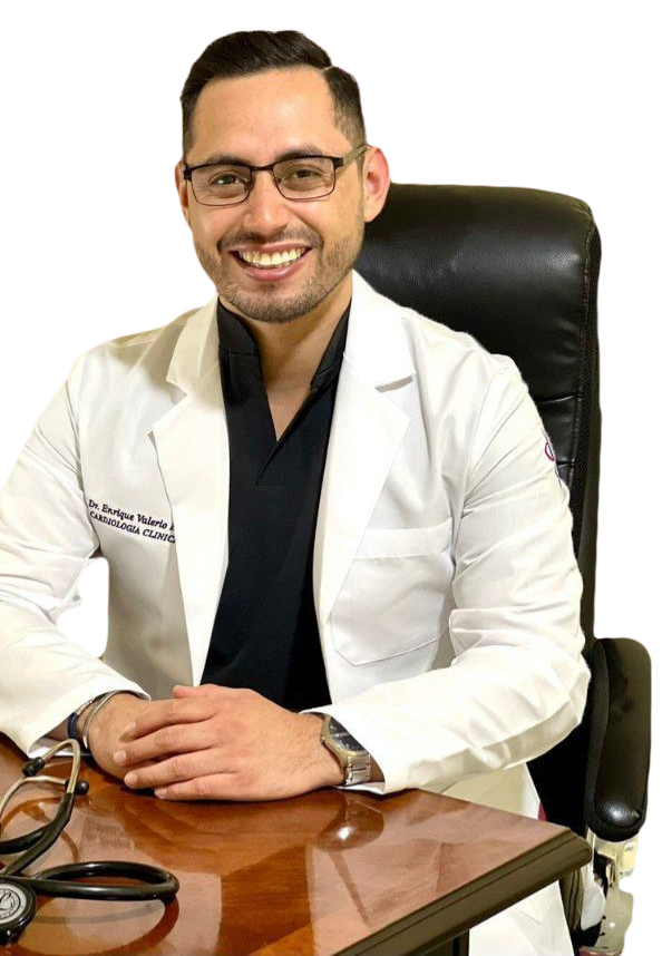 Dr. Enrique Valerio, médico cardiólogo con sólida trayectoria en el diagnóstico, manejo y tratamiento de enfermedades del corazón. Ofrece atención profesional, humana y basada en un diagnóstico certero y un manejo adecuado, explicando cada condición de forma clara y precisa para garantizar tratamientos personalizados.